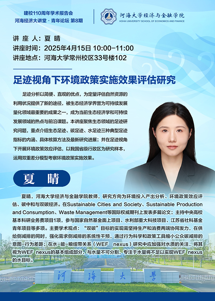 4月1日,学院邀请贾册老师为广大师生做了题目为“Do Industrial Plants Actively Respond to Short-Term Regulations? Evidence from Chinas Air Quality Alerts System”的学术讲座。主持人丁童慧老师向全体参与人员介绍了贾册博士的研究方向及此次讲座的主要内容。贾册博士通过系统解析中国重污染应急预警制度的运行机制,揭示了工业企业污染减排决策的深层动因。其研究创新性采用自然实验法发现:高强度执法下的高级别预警能显著激发企业减排响应,但预警频次与级别的动态调整易诱发企业“警报疲劳”,形成边际效应递减现象。基于实证数据,贾册博士指出环境监管强度是实现政策效力的关键变量,提出构建预警级别-执法力度动态适配模型的创新思路,为破解运动式治理困境、推进大气污染精准防治提供了新的理论框架。在互动环节,师生们就环境预警阈值设定、政企博弈模型构建等学术前沿问题,与贾册博士展开了深度对话。贾册,经济学博士,河海大学经济与金融学院教师。中国人民大学人口、资源与环境经济学博士(CSC公派美国康奈尔大学戴森应用经济与