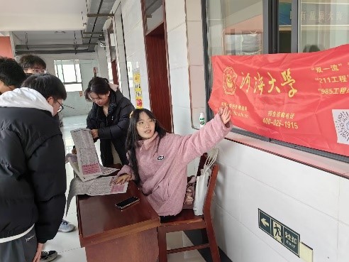 宣讲结束后,团队成员在放学时间人流量大的地方布置河海大学宣讲角,向来往的学弟学妹们介绍河海大学相关情况,并走出摊位,扩大宣传范围,结合同学们的实际情况进行一对一宣讲。