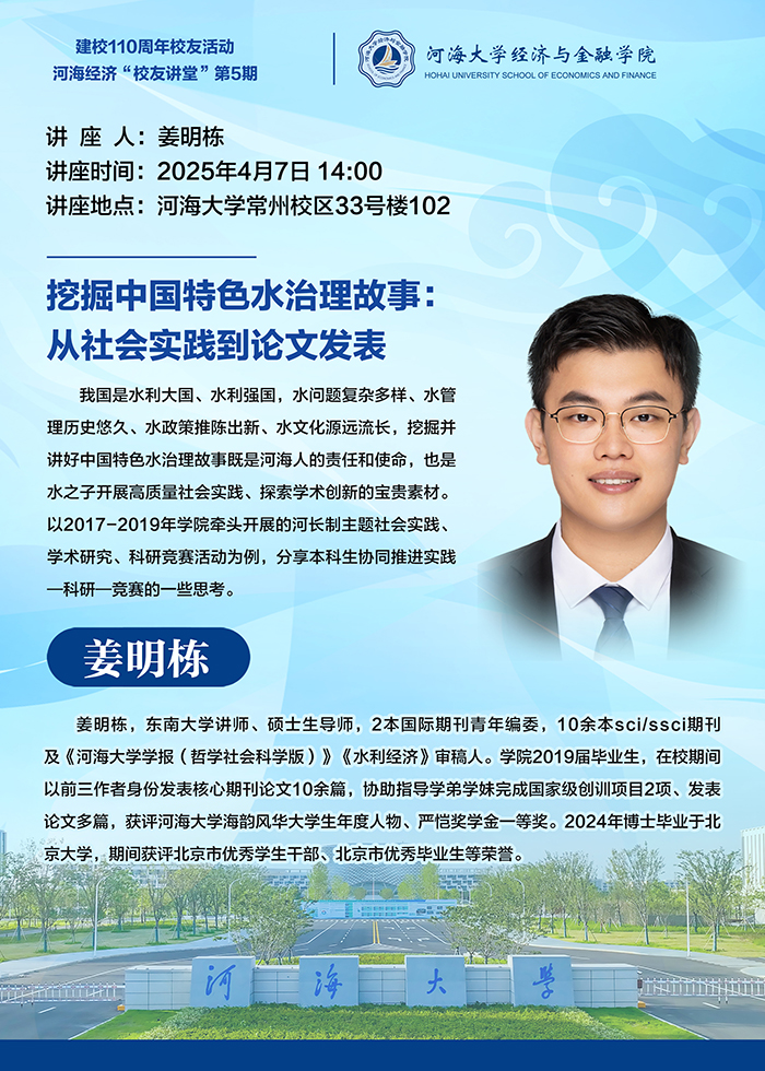 为庆祝建校110周年,持续加强与校友的沟通联系,充分发挥校友榜样引领作用,4月7日,经济与金融学院举办河海经济校友讲堂第5期《挖掘中国特色水治理故事:从社会实践到论文发表》。本期河海经济校友讲堂邀请学院2019届校友姜明栋担任主讲人。姜明栋校友结合本科期间参与学院牵头开展的河长制主题社会实践、学术研究、科研竞赛活动为例,与同学们分享自身对协同推进“实践-科研-竞赛”的思考。姜明栋以太湖蓝藻治理为例,剖析河长制从地方试点到全国推广的实践成效,强调其在破解“九龙治水”难题中的制度创新价值。他重点介绍了河海大学“河长制”学生团队自2017年以来的社会实践成果,学生团队深入江苏盐城、常州等地,聚焦农村水环境治理、河长制实施现状等议题,开展数十项调研项目,形成多篇核心期刊论文及政策建议,获常州市、盐城市水利部门采纳。相关成果被《中国水利报》《生态经济》等刊载。姜明栋校友提出水治理研究需“走出去”实践,结合政策热点与地域特色;鼓励学生把握时代机遇,以问题为导向,将调研转化为学术创新,助力中国水治理体系。姜明栋,现任东南大学讲师、硕士生导师。学院2019届毕业生,在校期间以前三作者身份发表核心期刊论