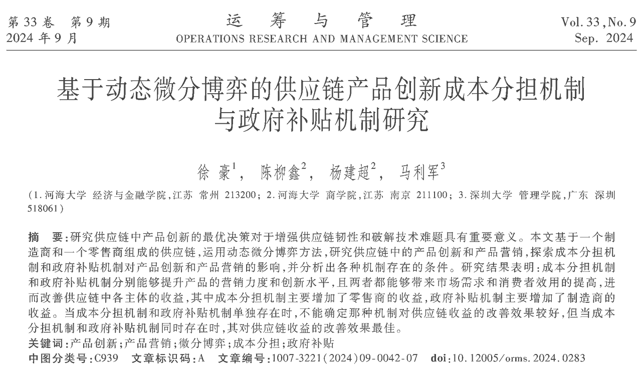 研究供应链中产品创新的最优决策对于增强供应链韧性和破解技术难题具有重要意义。本文基于一个制造商和一个零售商组成的供应链,运用动态微分博弈方法,研究供应链中的产品创新和产品营销,探索成本分担机制和政府补贴机制对产品创新和产品营销的影响,并分析出各种机制存在的条件。研究结果表明:成本分担机制和政府补贴机制分别能够提升产品的营销力度和创新水平,且两者都能够带来市场需求和消费者效用的提高,进而改善供应链中各主体的收益,其中成本分担机制主要增加了零售商的收益,政府补贴机制主要增加了制造商的收益。当成本分担机制和政府补贴机制单独存在时,不能确定那种机制对供应链收益的改善效果较好,但当成本分担机制和政府补贴机制同时存在时,其对供应链收益的改善效果最佳。该研究以“基于动态微分博弈的供应链产品创新成本分担机制与政府补贴机制研究”为题发表于《运筹与管理》。我院徐豪博士为第一作者,合作者包括河海大学商学院陈柳鑫教授、杨建超博士、深圳大学管理学院马利军教授。徐豪博士是河海大学经济与金融学院教师,研究方向为供应链管理和水资源管理,其在供应链中的产品创新和跨界流域额水资源管理等方面先后主持和参与了多项科研项目,并